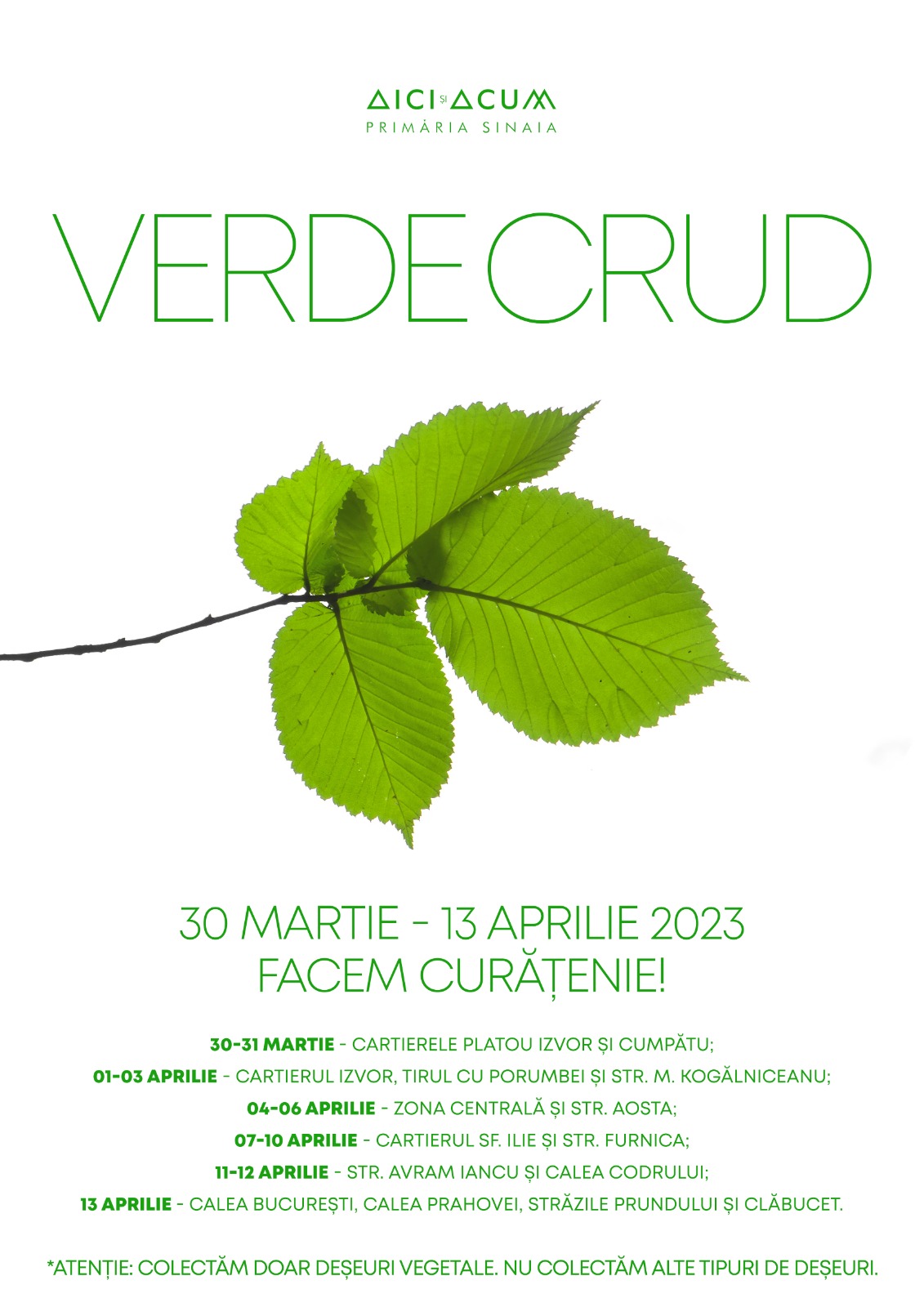 Primăria Sinaia anunță deschiderea Campaniei “Verde Crud 2023”, cea mai amplă acțiune de curățenie și înfrumusețare a orașului, care se va derula în perioada 30 martie – 13 aprilie 2023, pentru al 18-lea an consecutiv.